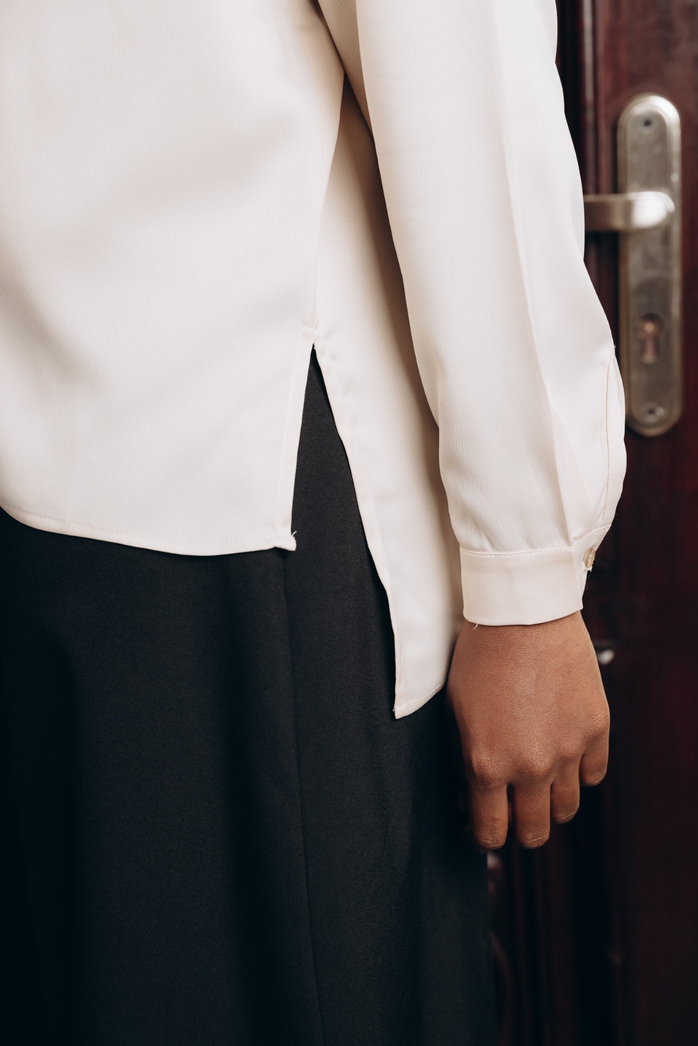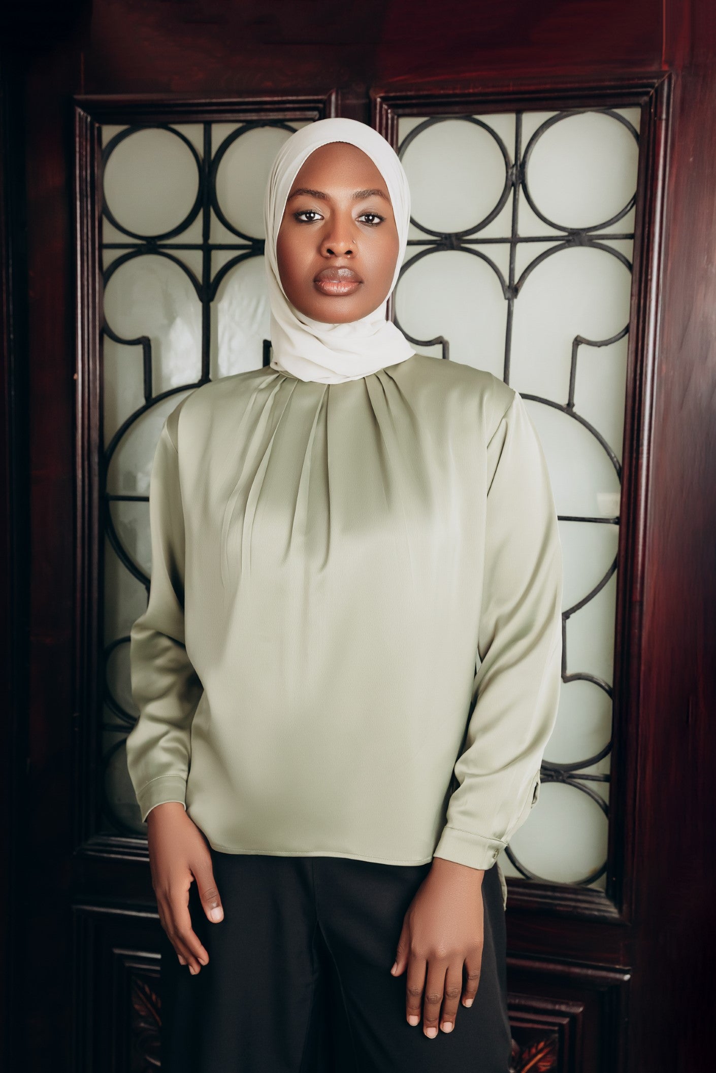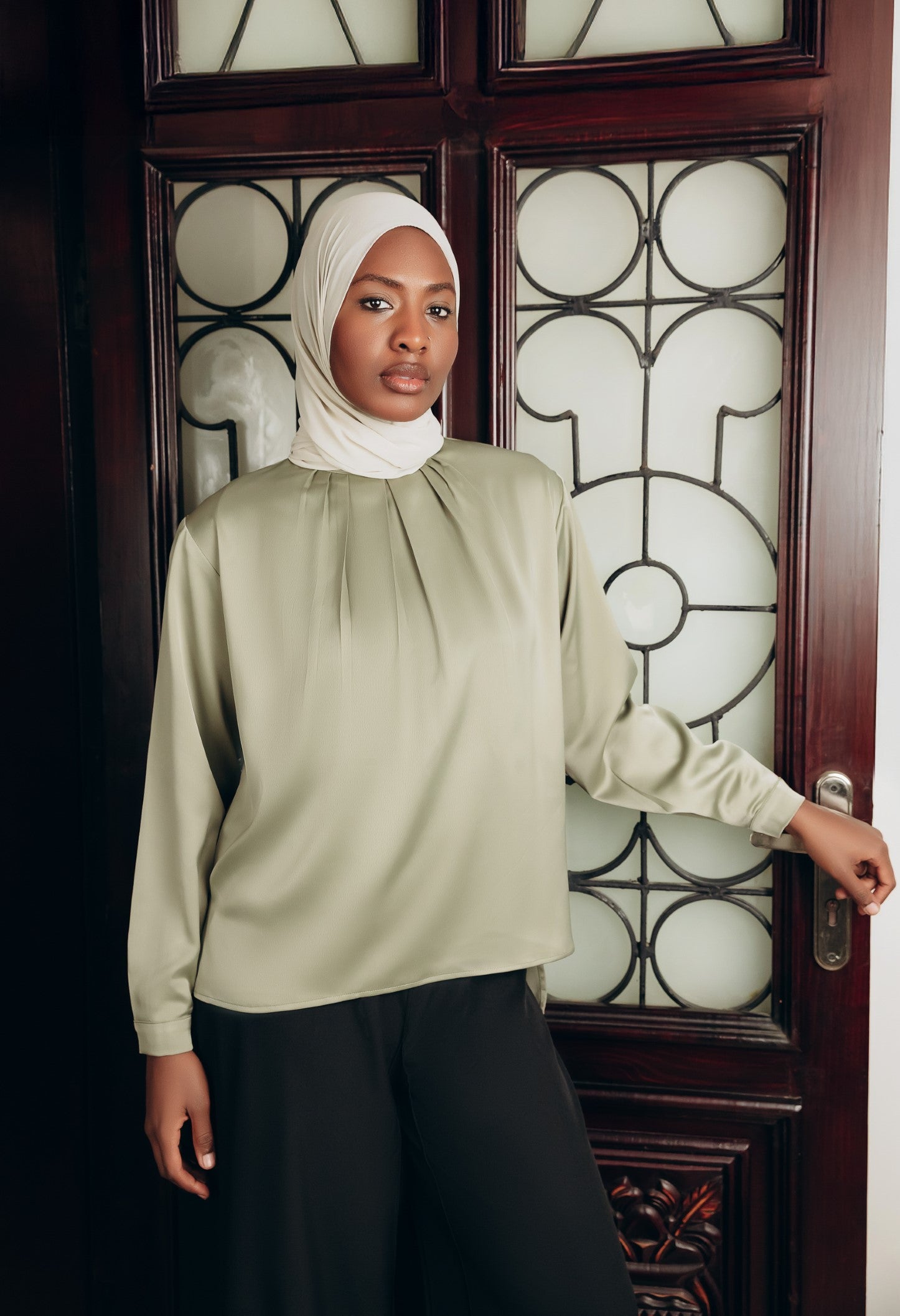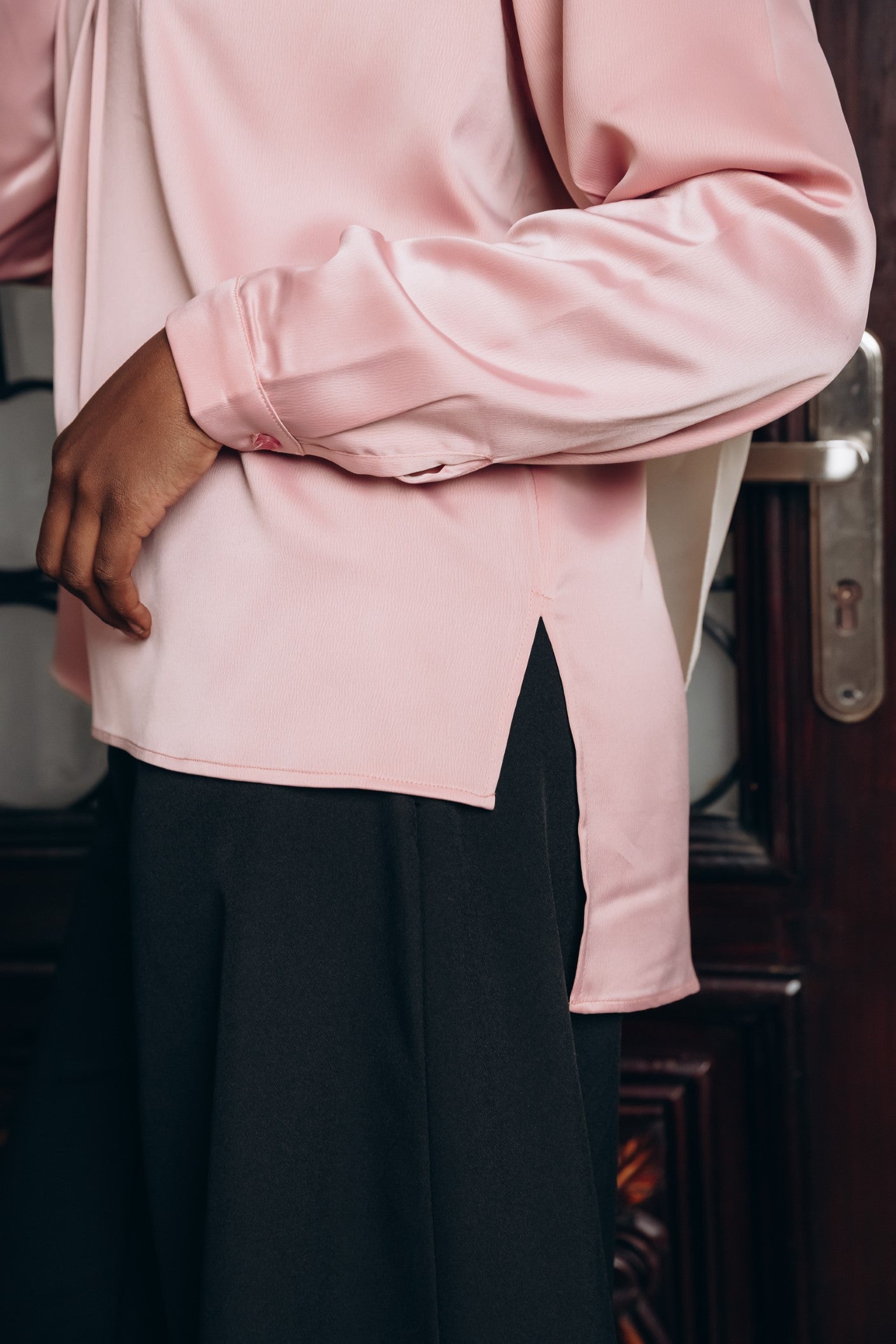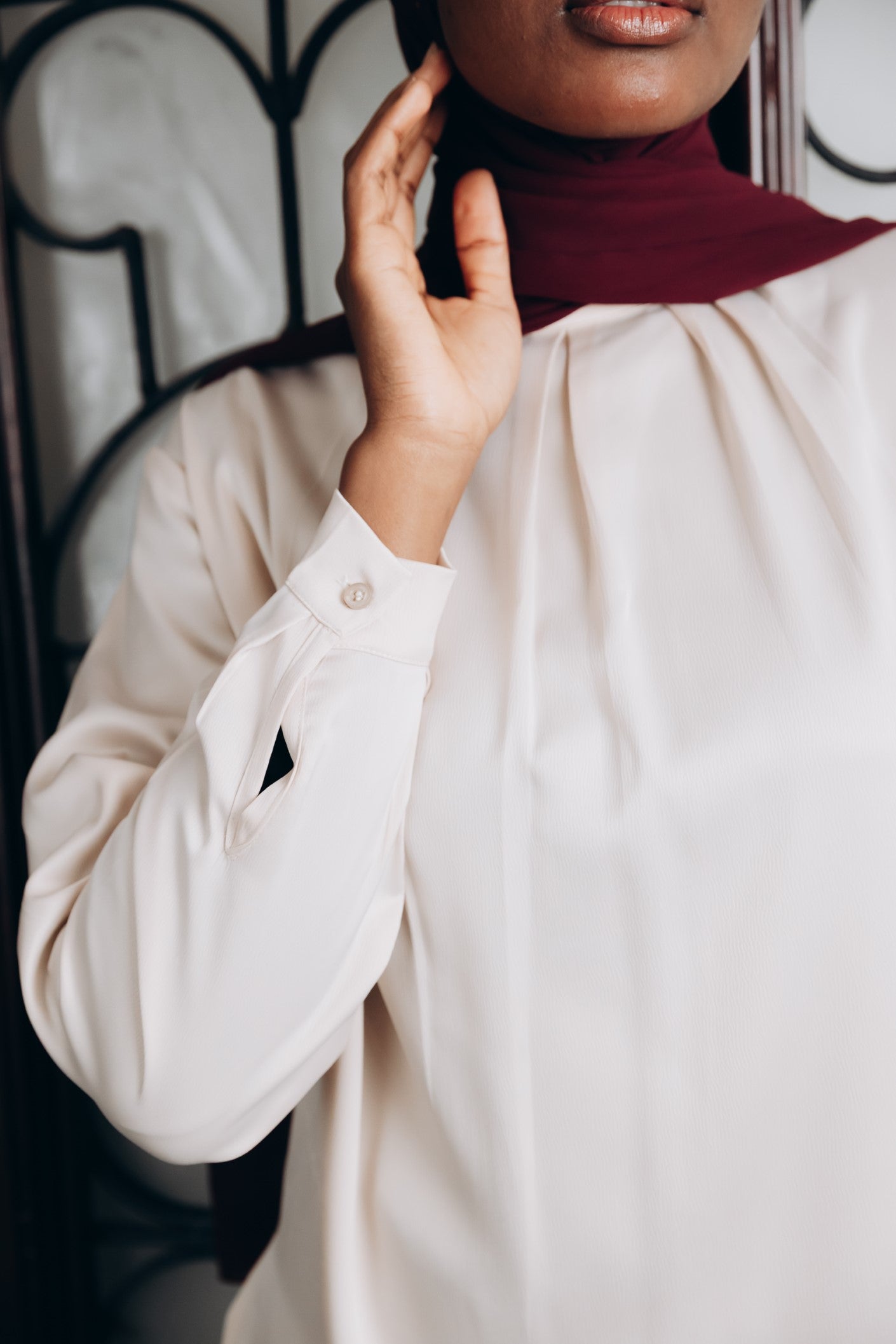 Elegant satin blouse with a round neckline, puffed long sleeves, and buttoned front — a timeless piece with a soft, subtle sheen