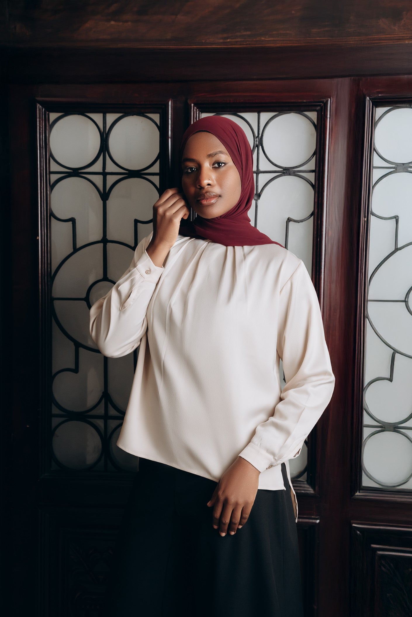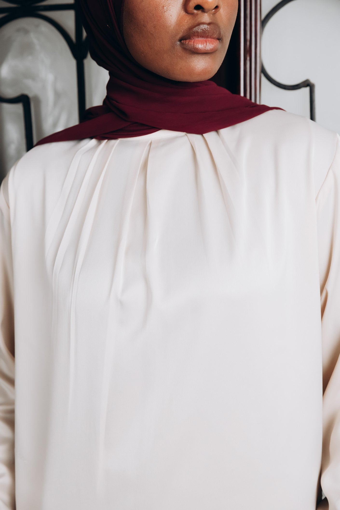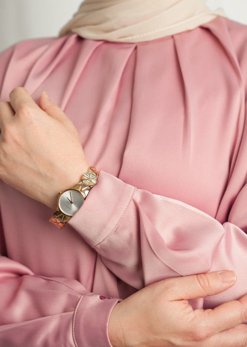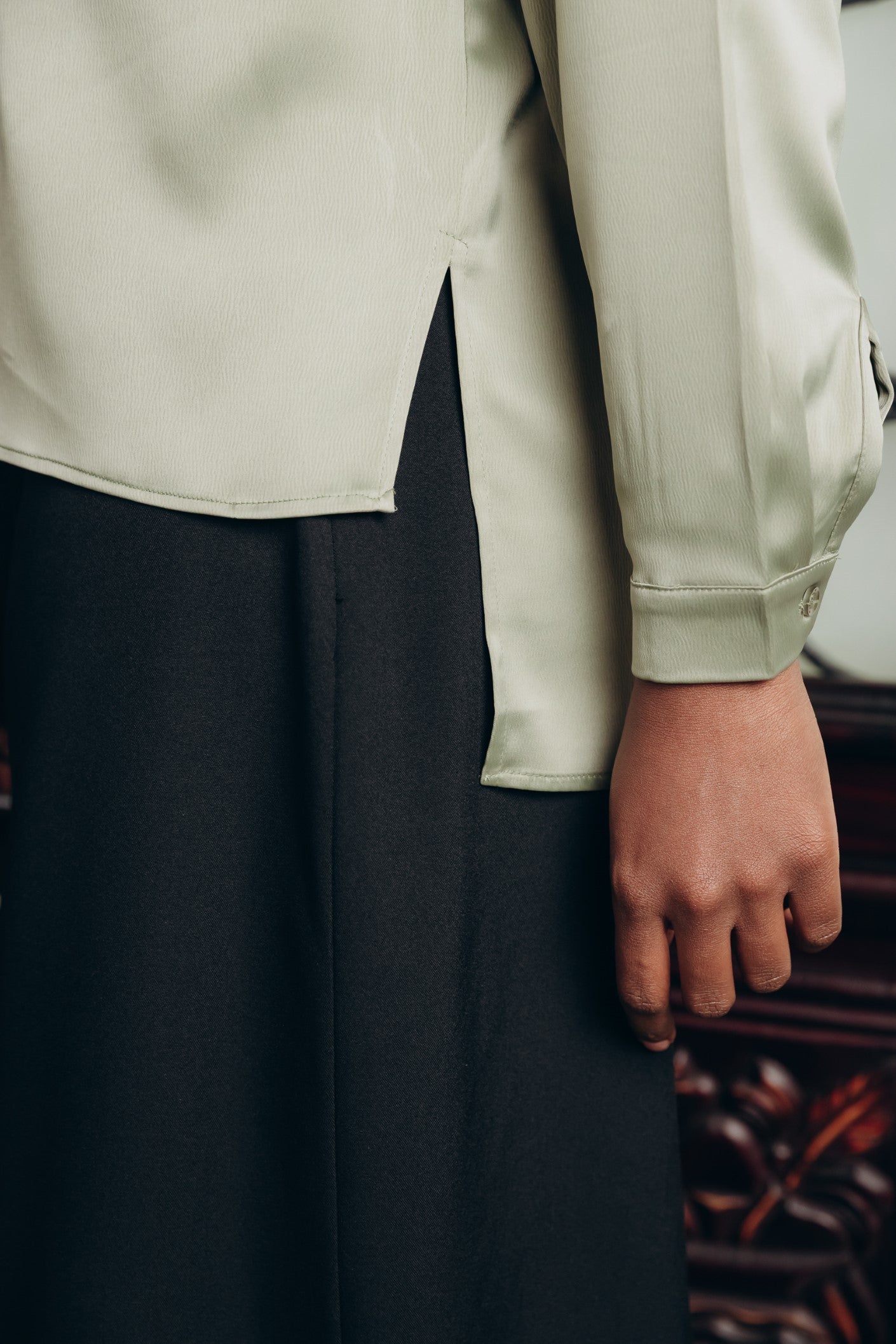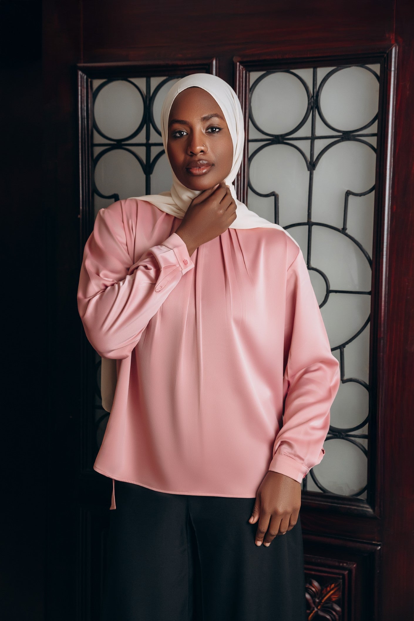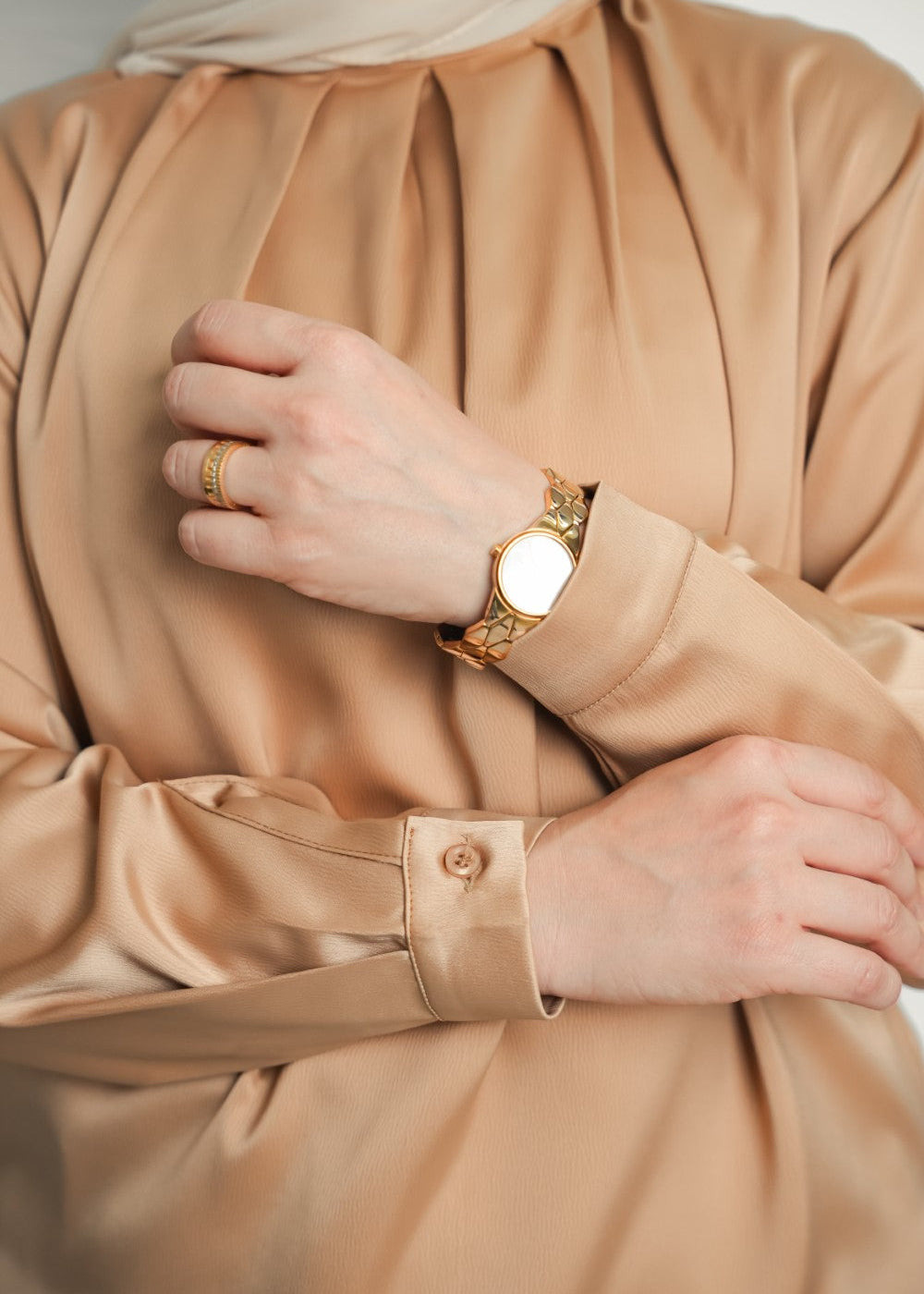 Elegant satin blouse with a round neckline, puffed long sleeves, and buttoned front — a timeless piece with a soft, subtle sheen