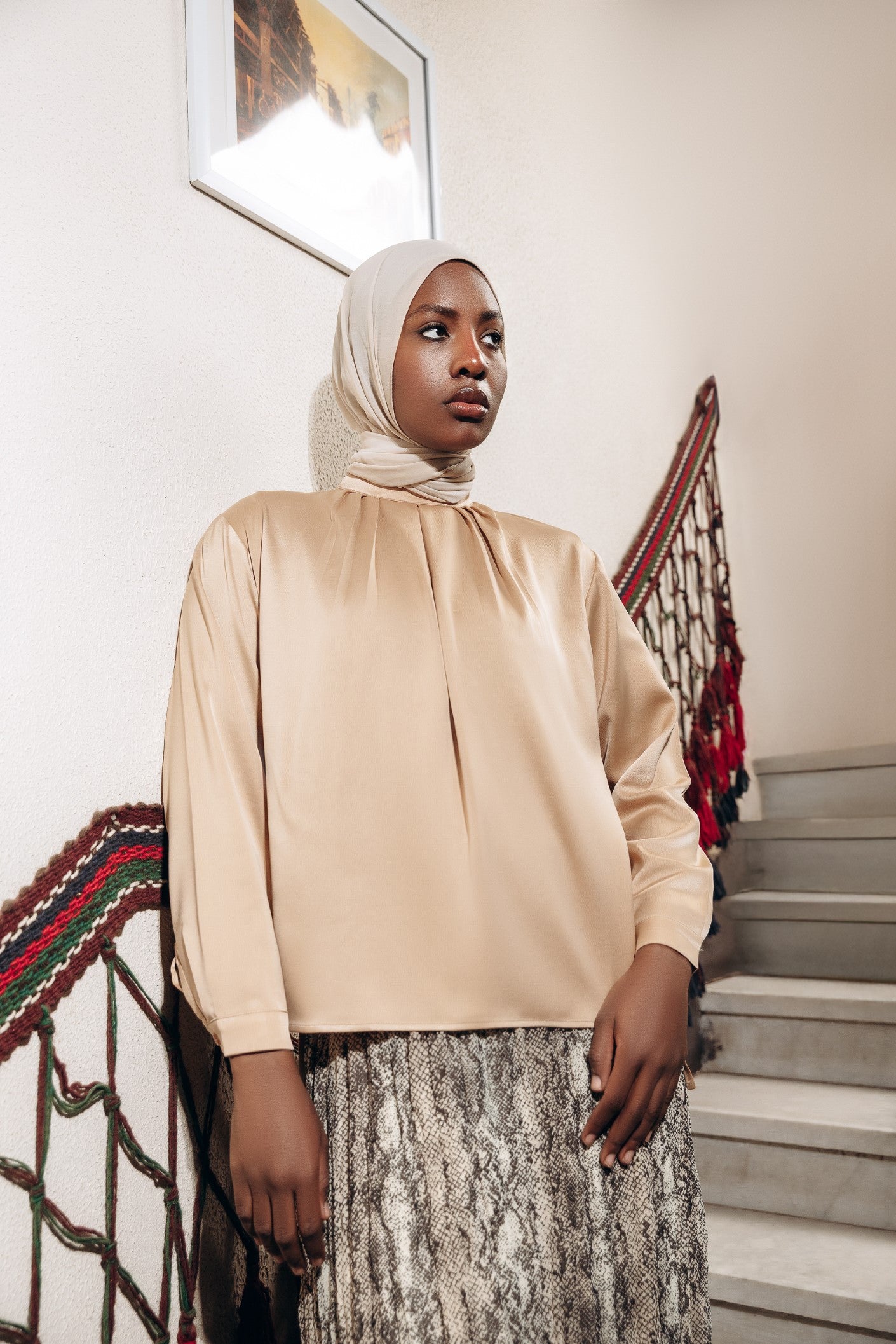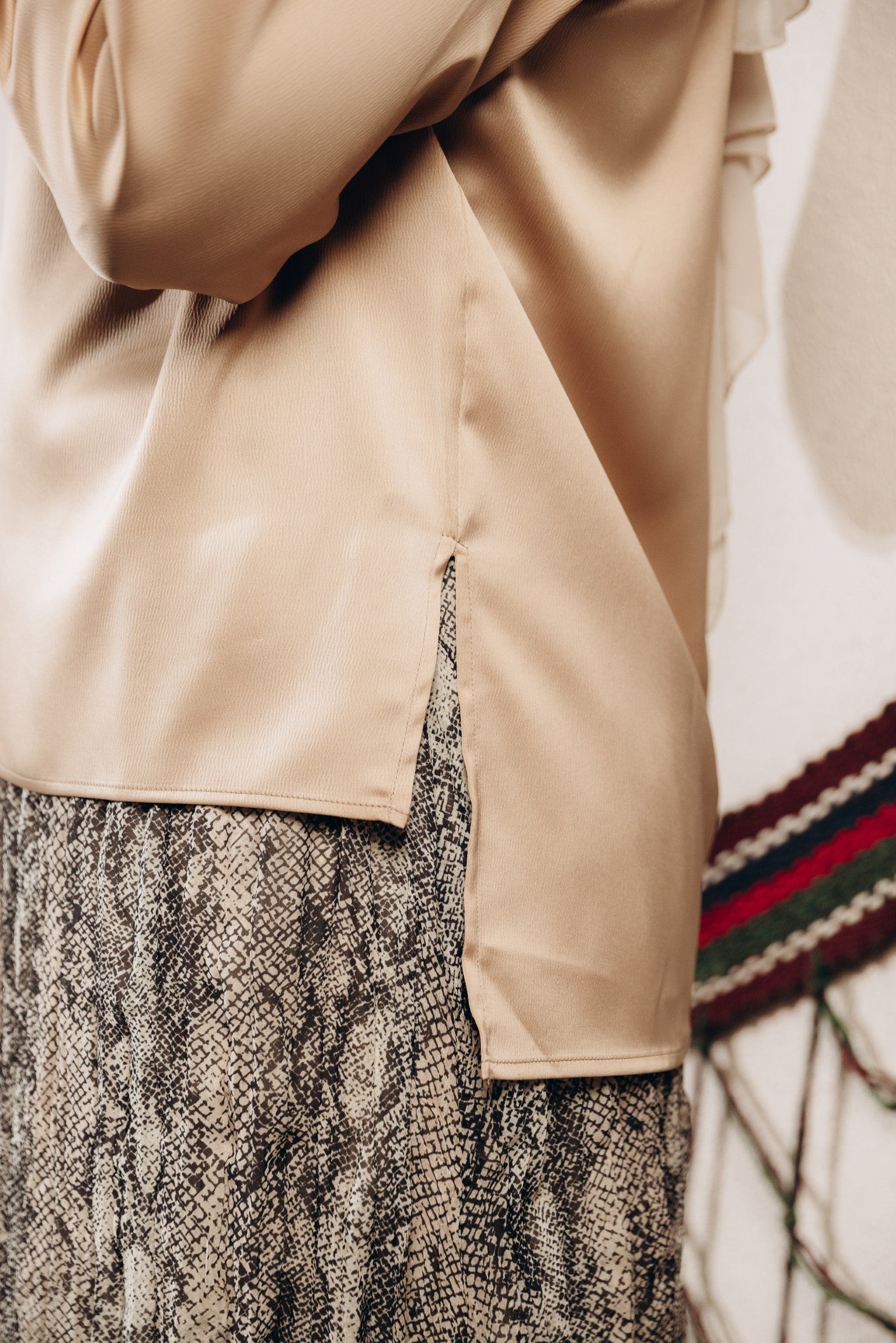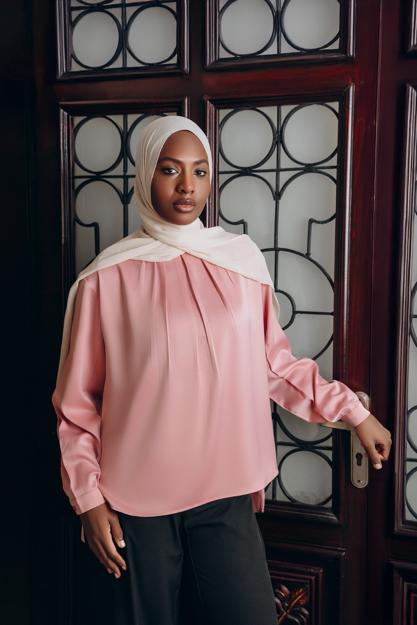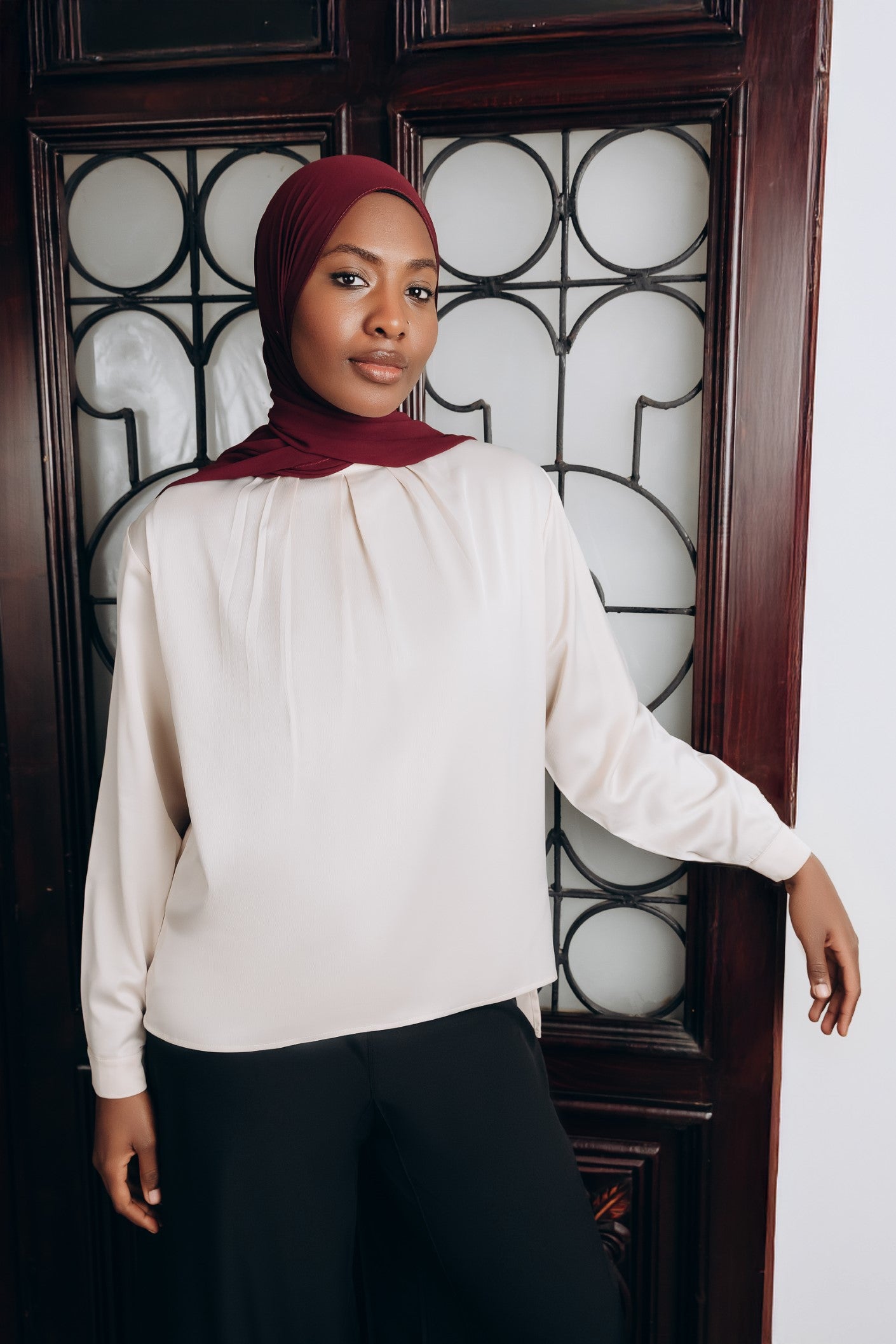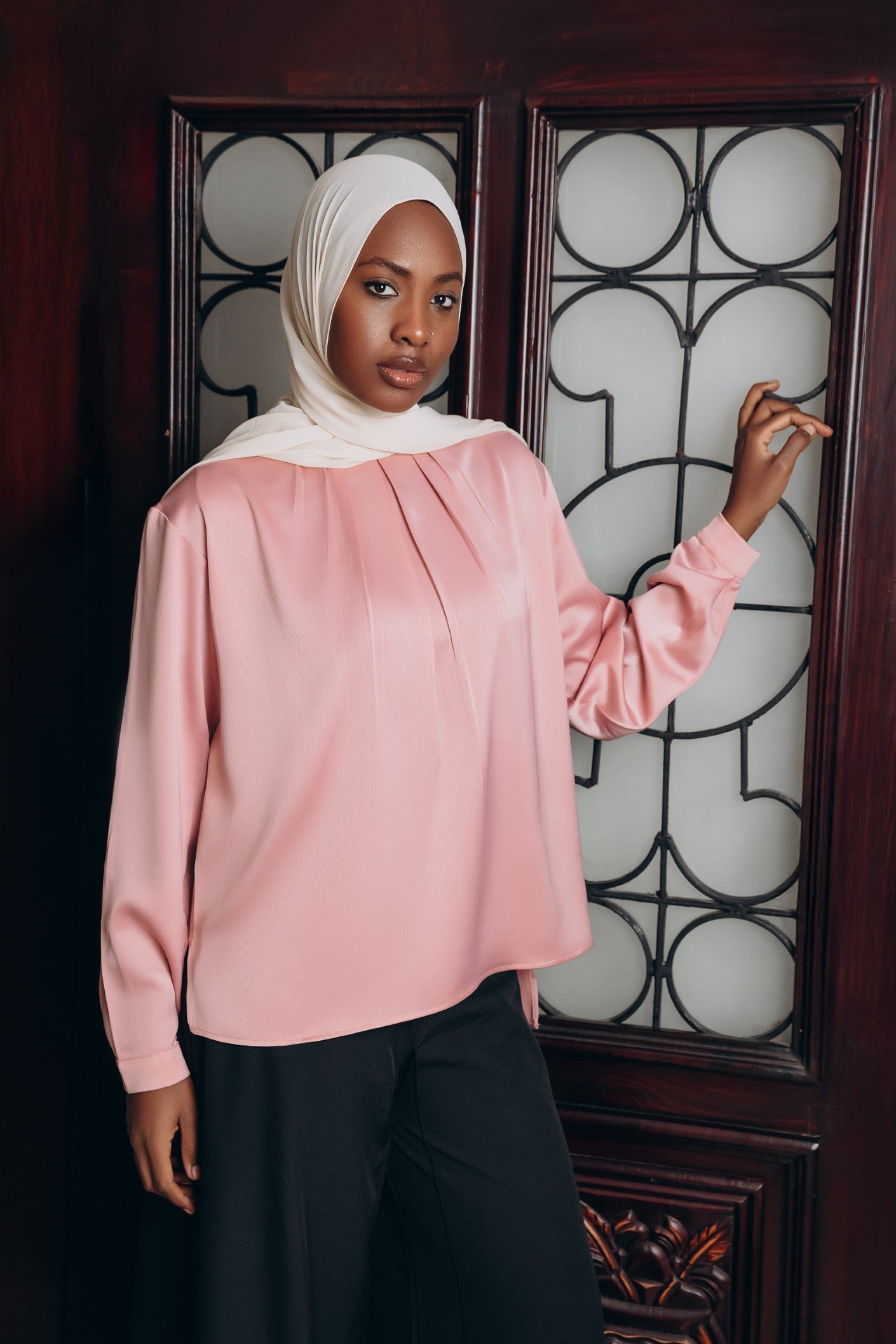 Elegant satin blouse with a round neckline, puffed long sleeves, and buttoned front — a timeless piece with a soft, subtle sheen