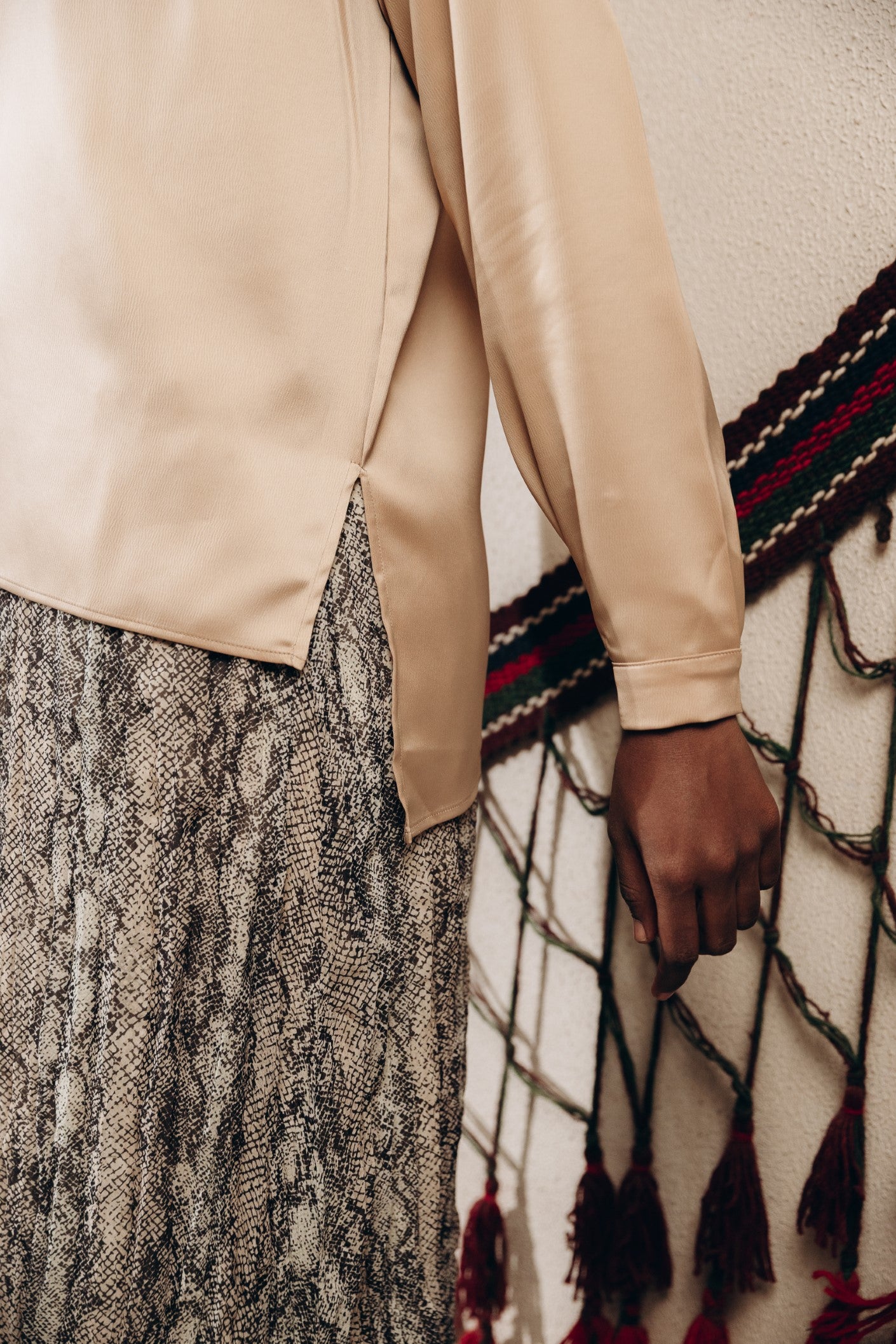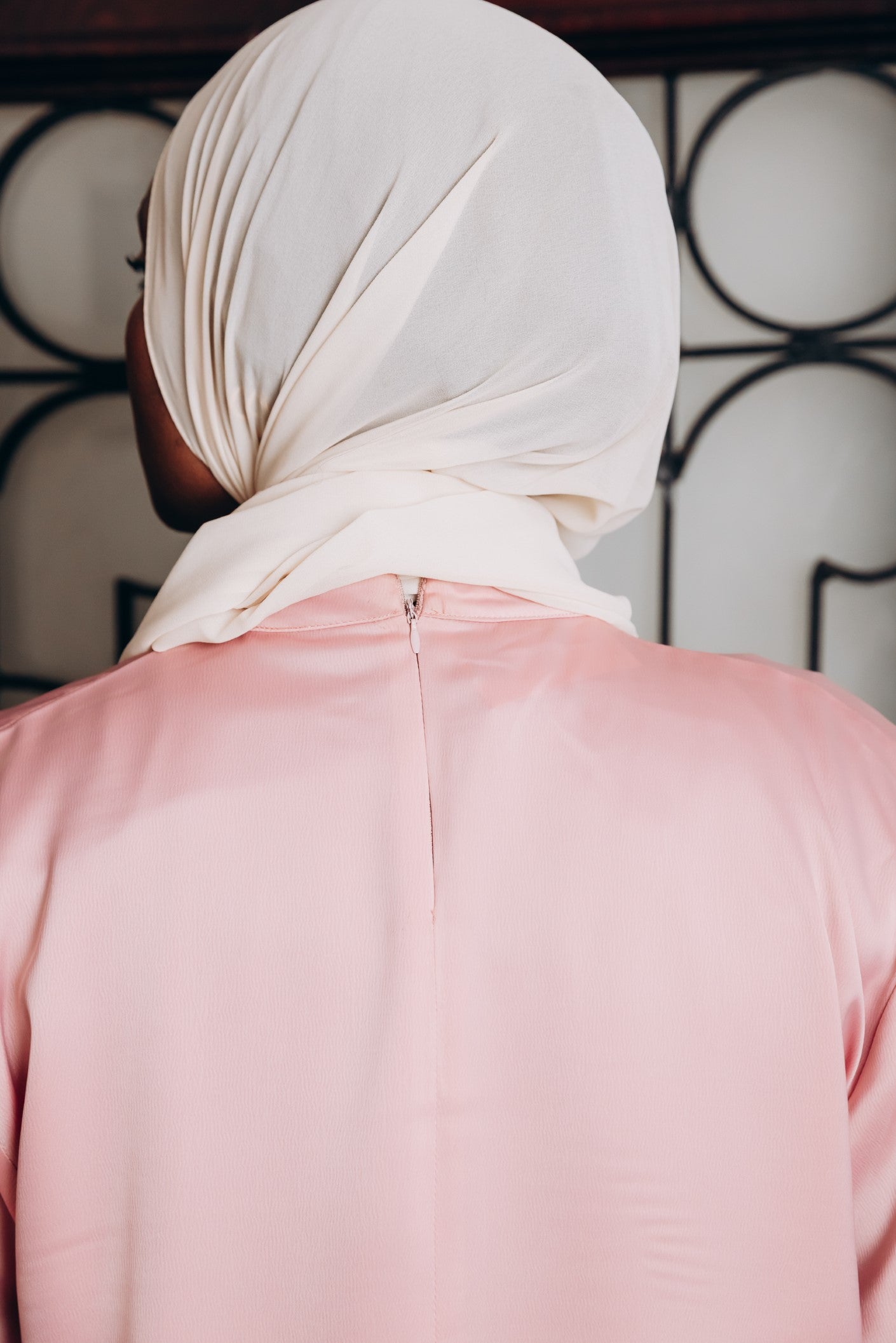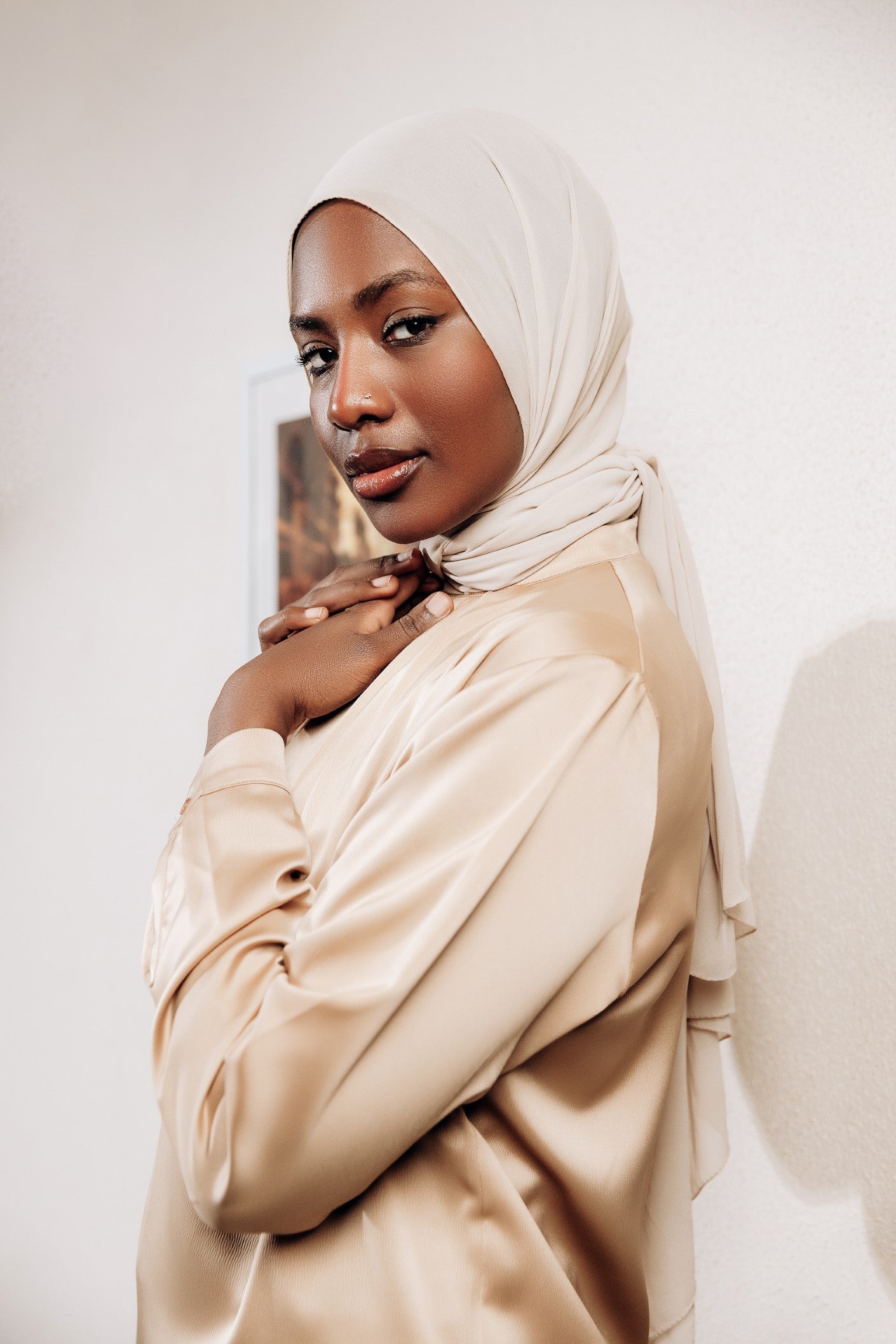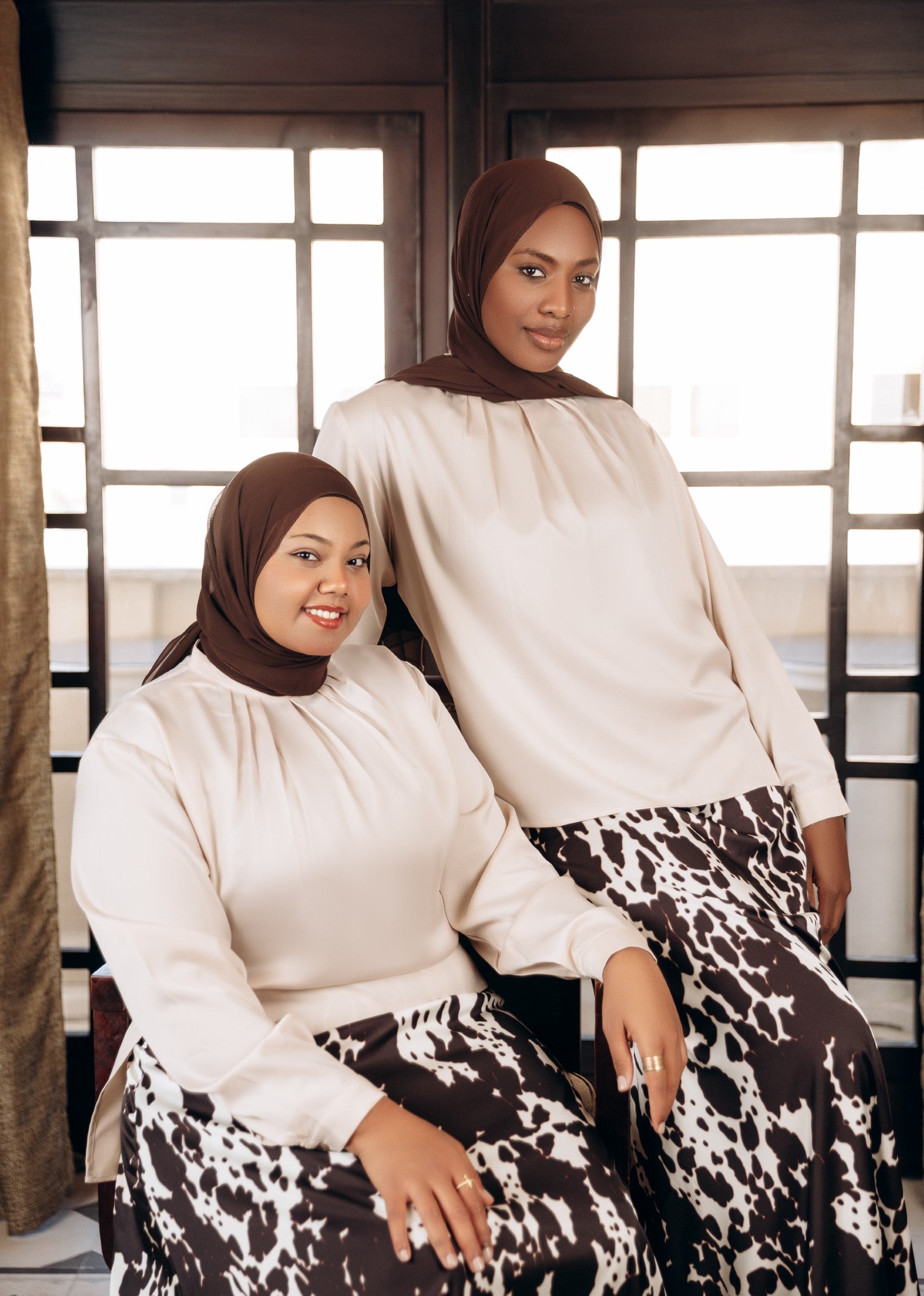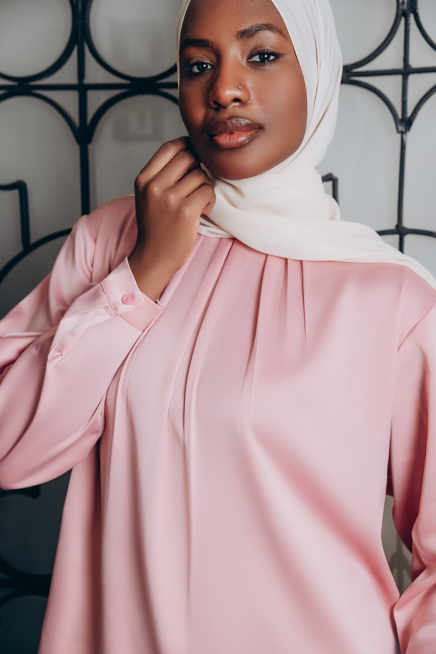 Elegant satin blouse with a round neckline, puffed long sleeves, and buttoned front — a timeless piece with a soft, subtle sheen