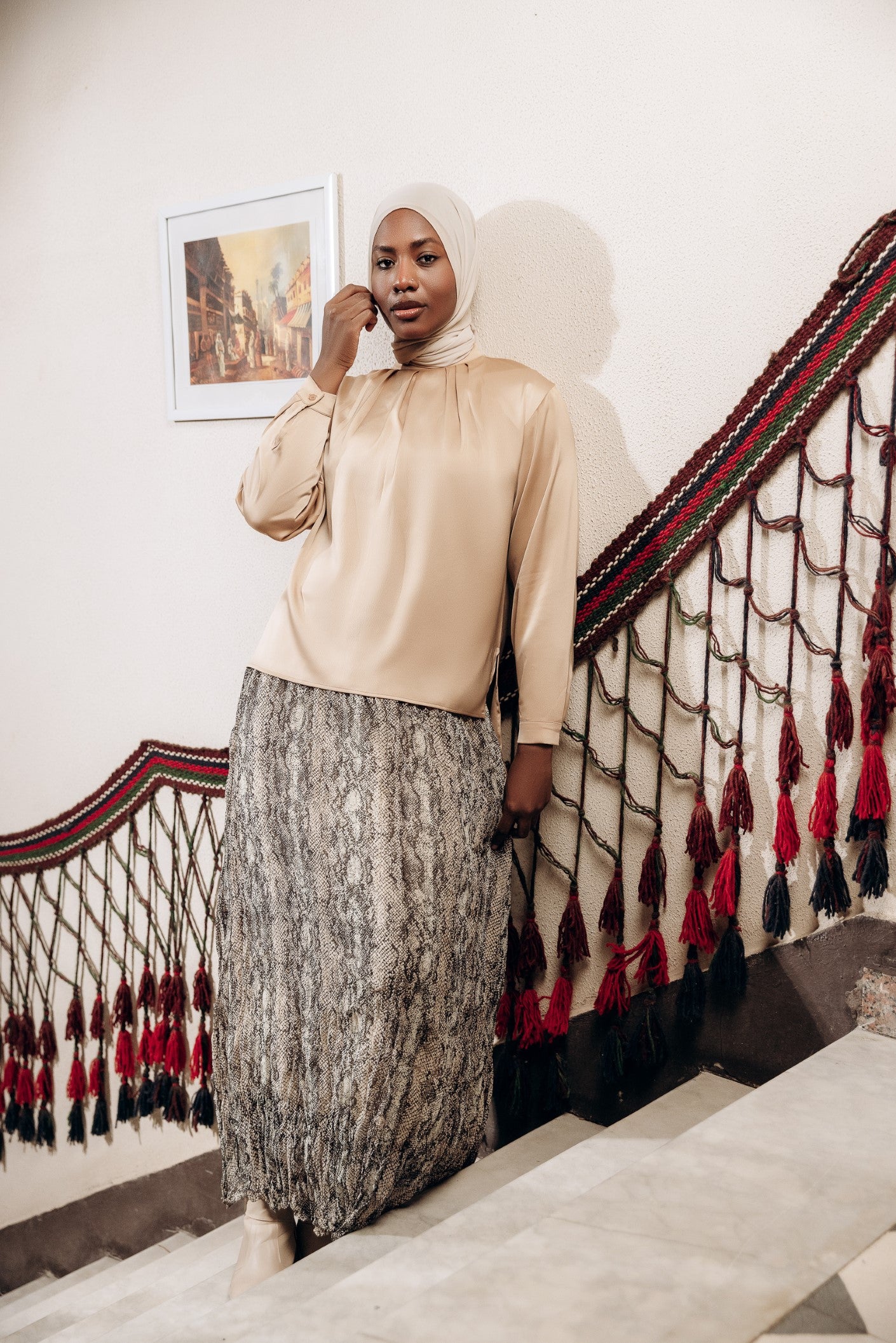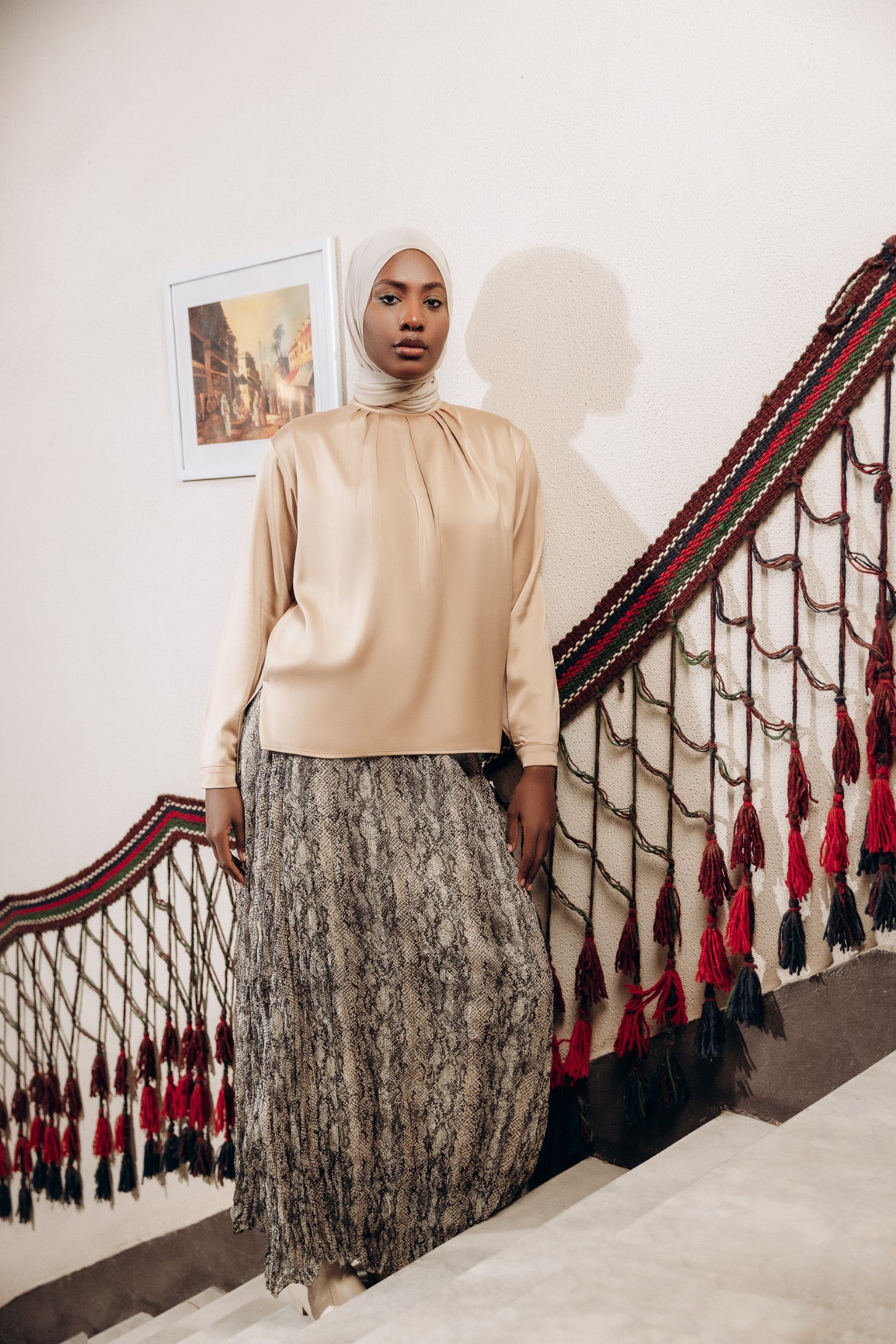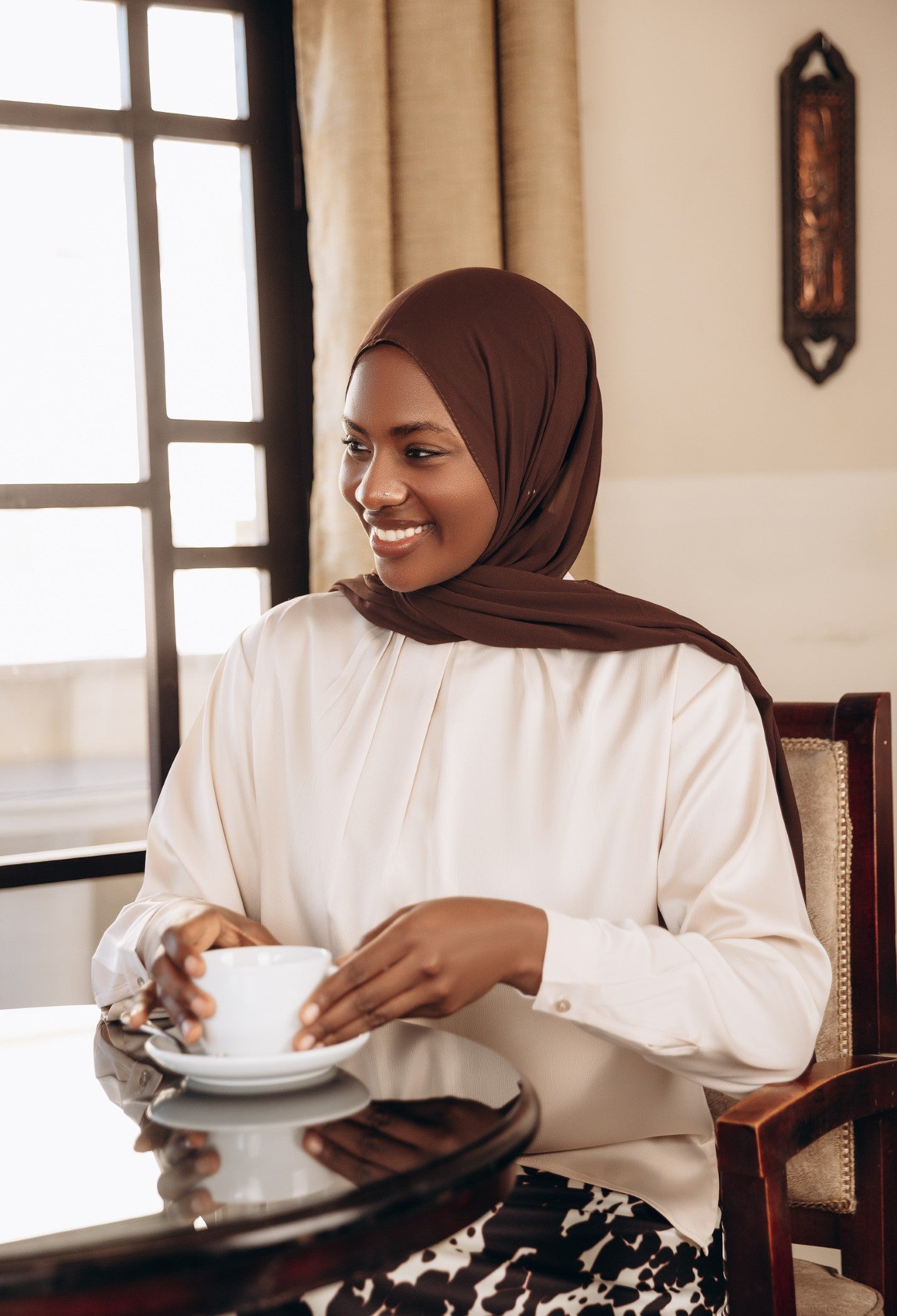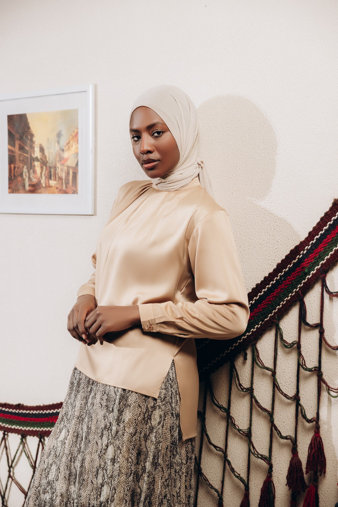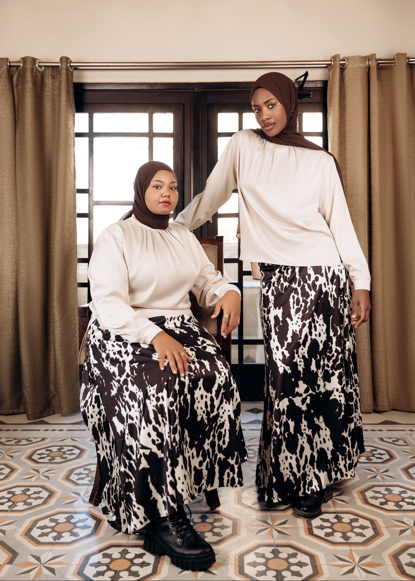 Elegant satin blouse with a round neckline, puffed long sleeves, and buttoned front — a timeless piece with a soft, subtle sheen